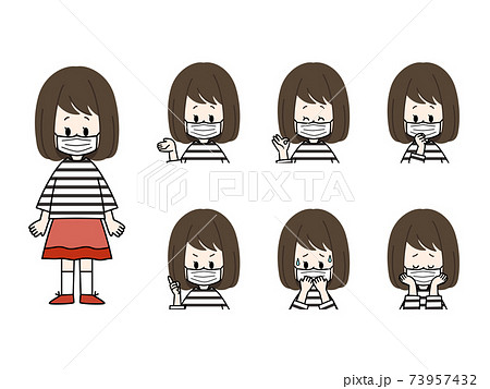 マスクをしている女の子の表情セットのイラスト素材